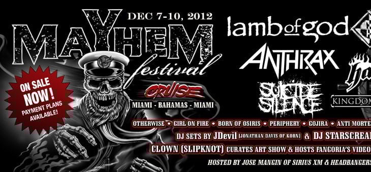 Summer is here! The weather is getting warmer, the women are getting hotter, and the music is getting louder. What better to do than plan your vacation… for winter? That might sound strange, but when the snow’s falling and everyone’s shut indoors, wouldn’t you rather be out cruising the Caribbean with some of metal’s biggest bands?! This December, the Mayhem Festival Cruise is just that: fifteen insanely heavy metal bands, two famed DJs, and thousands of their biggest fans. Acts like Anthrax, Lamb of God, Machine Head, and many more will be putting on shows for their shipmates. These modern day pirates of metal will rock the boat with no remorse. Metal icon and longtime Seymour Duncan user Scott Ian says that “I’m actually a little nervous about being on the boat for three days with Machine Head and Lamb of God.” And with good cause because it will be three days of nonstop brutality unleashed upon Carnival’s cruise ship Imagination. One can only imagine the mark this cruise will leave upon those brave enough to venture onboard.